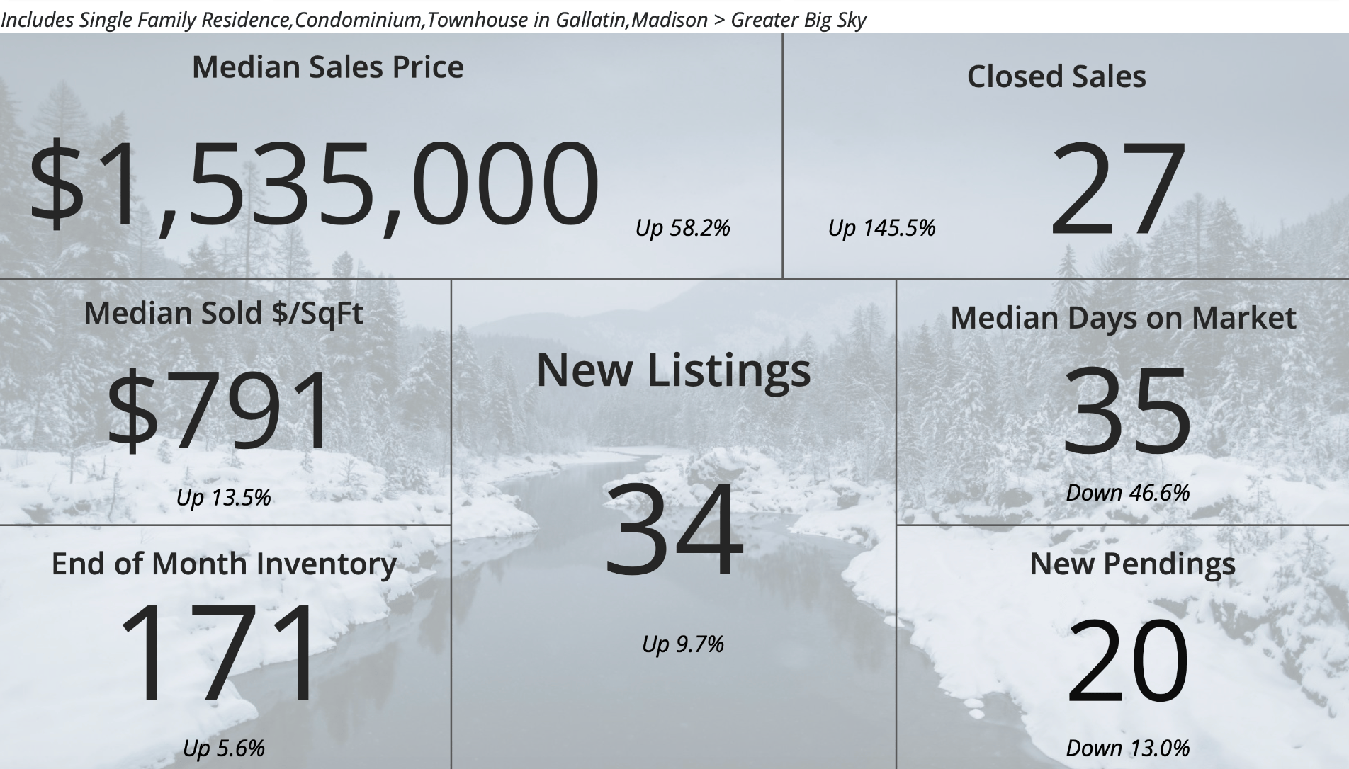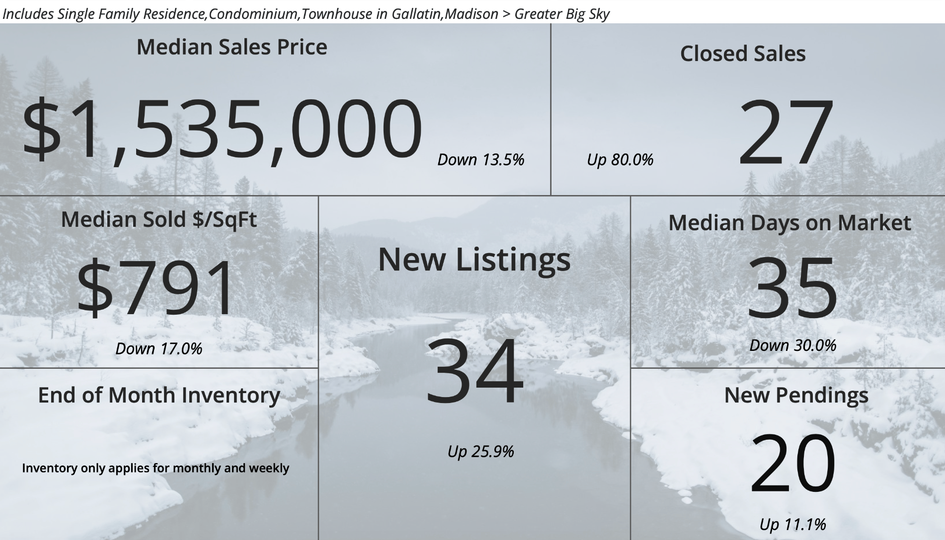 These market statistics are meant to give a general overview of trends in the Big Sky real estate market with comparisons to the previous month, and the same month one year earlier. For a more in-depth analysis of a specific area, complex or neighborhood within Big Sky, please contact Callie for a Comparative Market Analysis at [email protected].